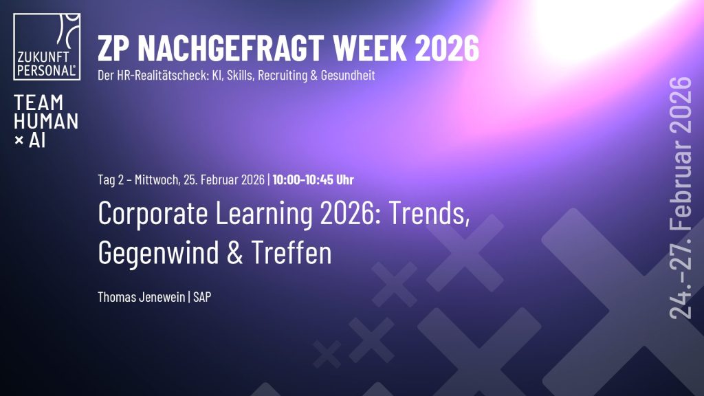 Wie geht es mit Corporate Learning nach dem KI-getriebenen Jahr 2025 weiter? In der ZP Nachgefragt Week ordnet Thomas Jenewein (SAP) am Mittwoch, 25. Februar 2026, von 10:00 bis 10:45 Uhr die wichtigsten Entwicklungen für Learning & Development 2026 ein.