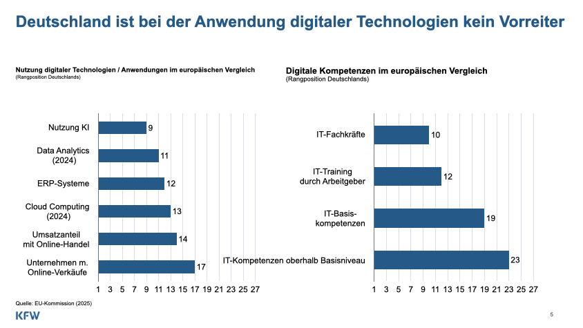 Dirk Schumacher hat diesen Befund in seiner KfW-Präsentation mit der Nüchternheit eines Chefvolkswirts formuliert, was ihn nur noch eindringlicher macht: Das Produktivitätswachstum in Deutschland sinkt seit Jahren, die Digitalisierungsaktivitäten im Mittelstand verlieren „deutlich an Schwung“, und die Unterschiede zwischen Vorreitern und Nachzüglern sind signifikant. Deutschland ist bei der Anwendung digitaler Technologien allenfalls europäisches Mittelfeld; bei höheren digitalen Kompetenzen ist das Bild noch magerer. Wer daraus nur ein Bildungsproblem macht, verharmlost die Lage. Wer daraus nur ein Finanzierungsproblem macht, ebenso.