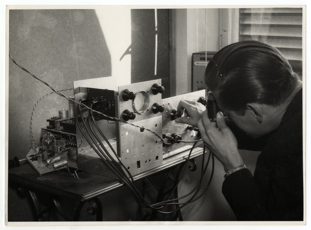Herbert W. Franke, 1954 vor seinem selbst-gebauten Analogrechner, mit dem die Serie „Oszillogramme“ entstand. © Stiftung Herbert W. Franke