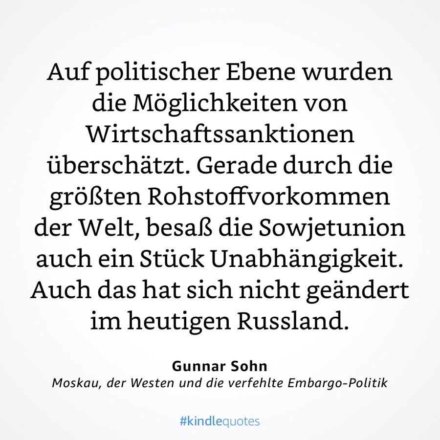 Letztlich stärken die Sanktionen die Autarkie-Bestrebungen in den sanktionierten Staaten. Vergleichbar mit dem von US-Präsident Ronald Reagan vorangetriebenen Erdgas-Röhren-Embargo Anfang der 1080er Jahre. Pipelines konnte die Sowjetunion dann auch ohne Kooperationen mit Mannesmann und Co. technologisch stemmen. Das Getreidegeschäft der USA mit Moskau lief in dieser Zeit übrigens muter weiter.