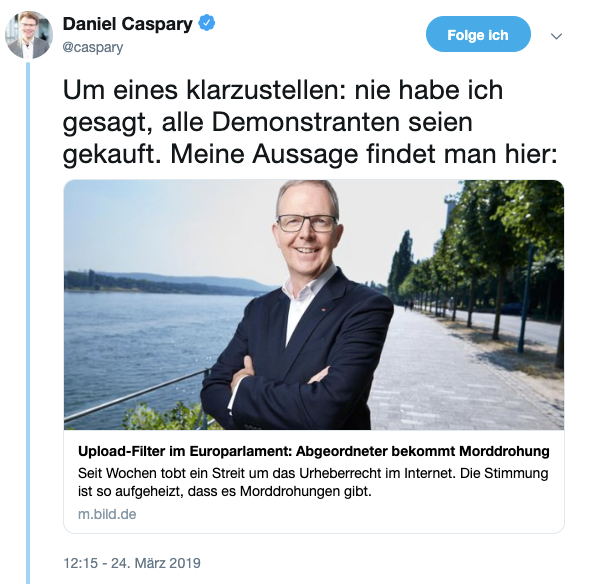 „Casparys Verdacht: ‚Nun wird offensichtlich versucht, auch mit gekauften Demonstranten die Verabschiedung des Urheberrechts zu verhindern. Bis zu 450 Euro werden von einer sogenannten NGO für die Demoteilnahme geboten. Das Geld scheint zumindest teilweise von großen amerikanischen Internetkonzernen zu stammen. Wenn amerikanische Konzerne mit massivem Einsatz von Desinformationen und gekauften Demonstranten versuchen, Gesetze zu verhindern, ist unsere Demokratie bedroht.'“