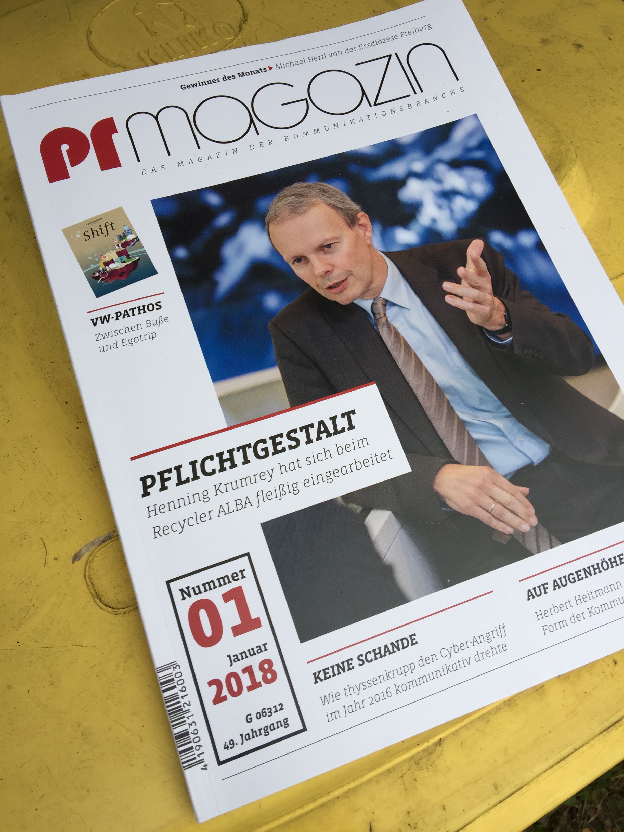 Henning Krumrey hat 27 Jahre als politischer Journalist gearbeitet, zuletzt als stellvertretender Chefredakteur der Wirtschaftswoche. Nun ist er Kommunikationschef der Alba Group, so das prmagazin in der Titelstory im Januar.
