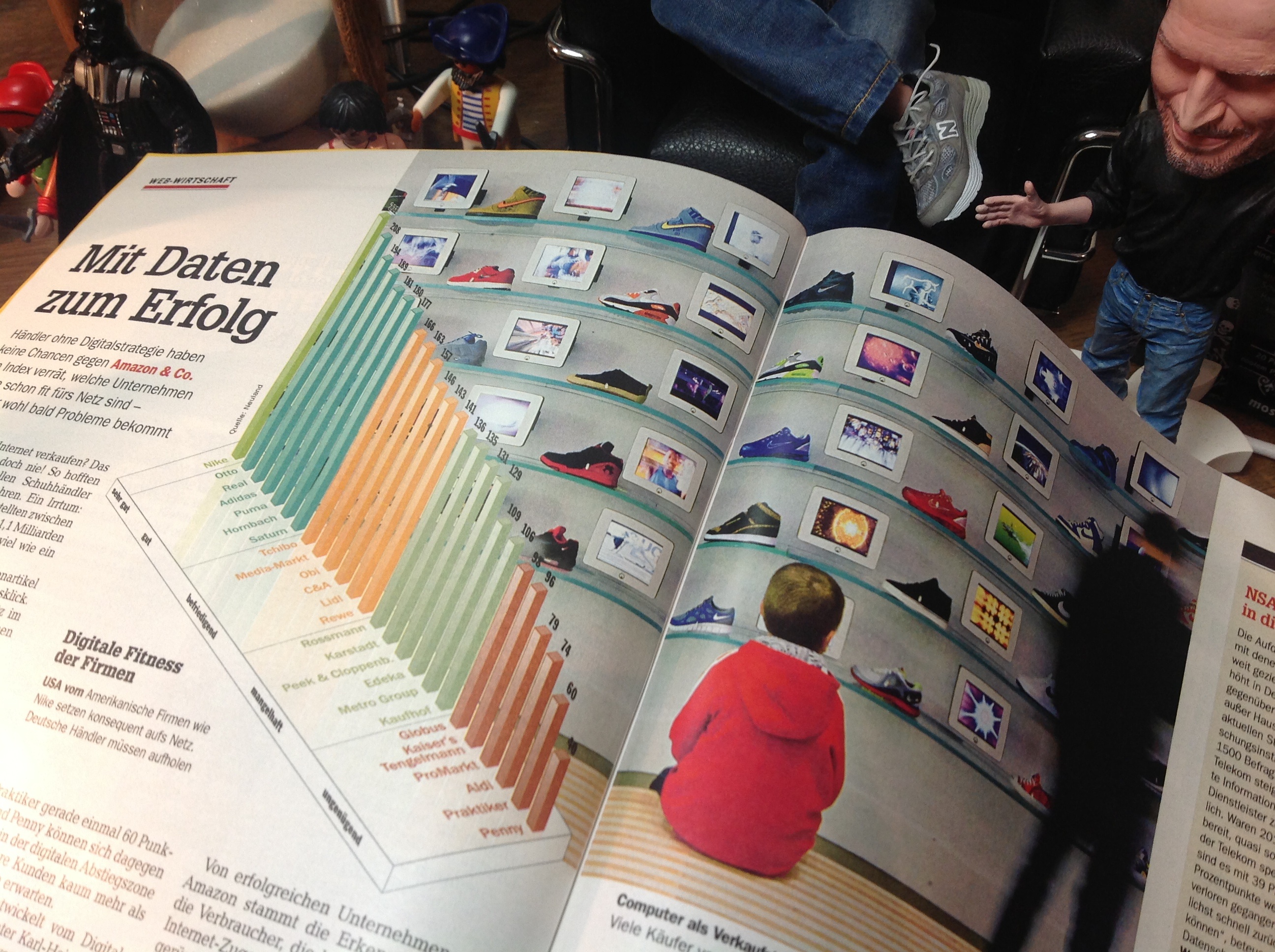 „Noch 2011 hatten viele deutsche Händler gehofft, dass sich das Internet hierzulande nicht so negativ auf ihre Umsätze auswirken werde wie etwa in den USA (gleiches trällerten ja die Verlegen, gs). Spätestens der Erfolg des Modehändlers Zalando hat sie wachgerüttelt (wirklich?, gs). Alle großen Handelsunternehmen arbeiten inzwischen an Digitalstrategien“, schreibt Focus-Redakteur Holger Schmidt.