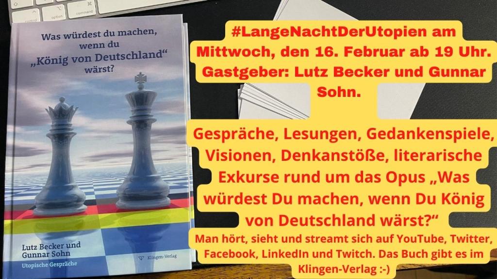 Ziel unseres Projektes #KönigvonDeutschland ist es, Möglichkeitsräume durch utopisches Denken zu eröffnen und über öffentliche Debatten im Social Web zu erschließen. Das Ganze – Buch und Podcast – dreht sich um Rio Reisers Textzeile „Das alles, und noch viel mehr | würd’ ich machen, wenn ich König von Deutschland wär“.