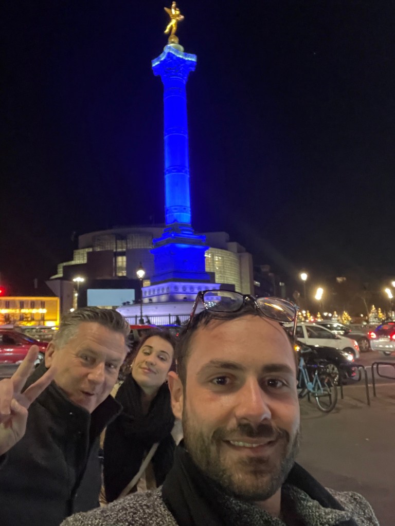 Du hast diese Spannung in deinen Bildern eingefangen: draußen die Straße, die Lichterketten, das Hotel-Schild, die Bastille-Nähe – Paris als Bühne. Drinnen ein Tisch, Freunde, ein Glas Rotwein, eine hohe Wasserflasche, ein Moment, der sich nicht beschleunigen lässt, weil er bereits vollständig ist. Und später die Bastille-Säule, blau leuchtend wie ein kaltes Ausrufezeichen in der Nacht: Freiheit, die in Paris immer auch Beleuchtung ist – Symboltechnik im Stadtraum.