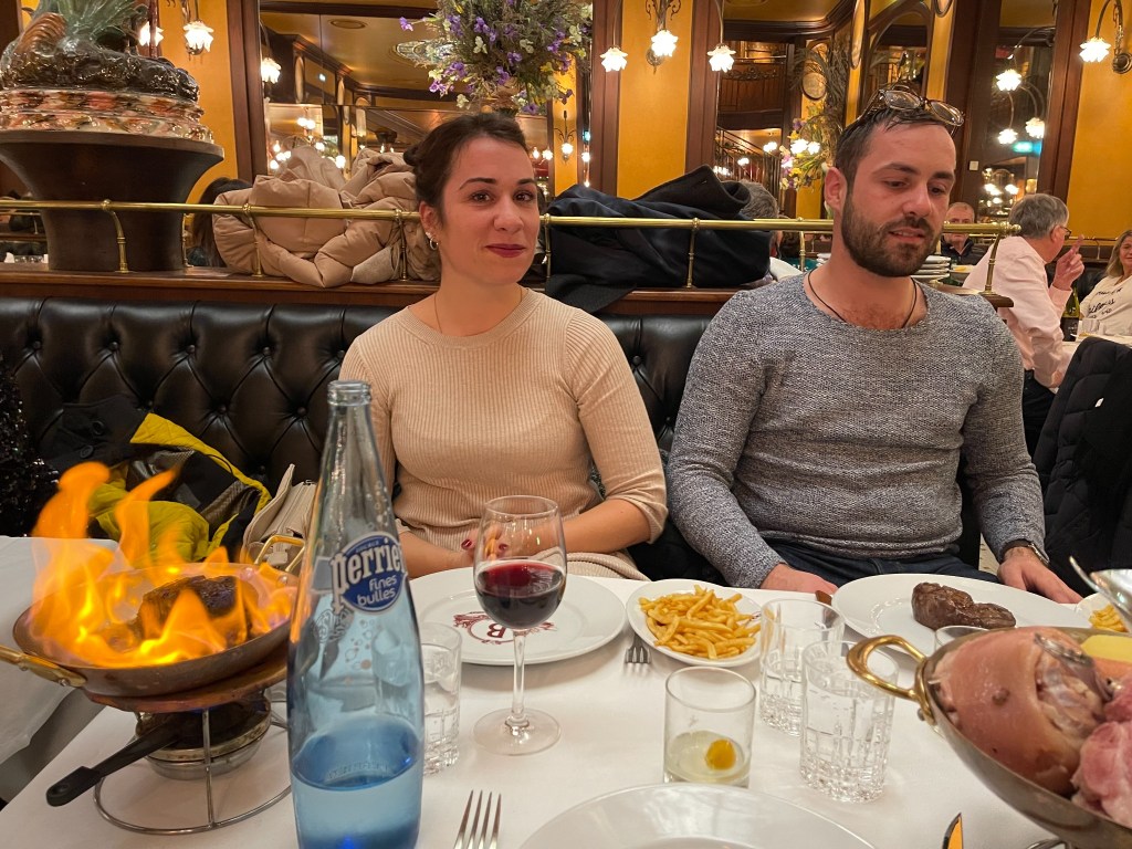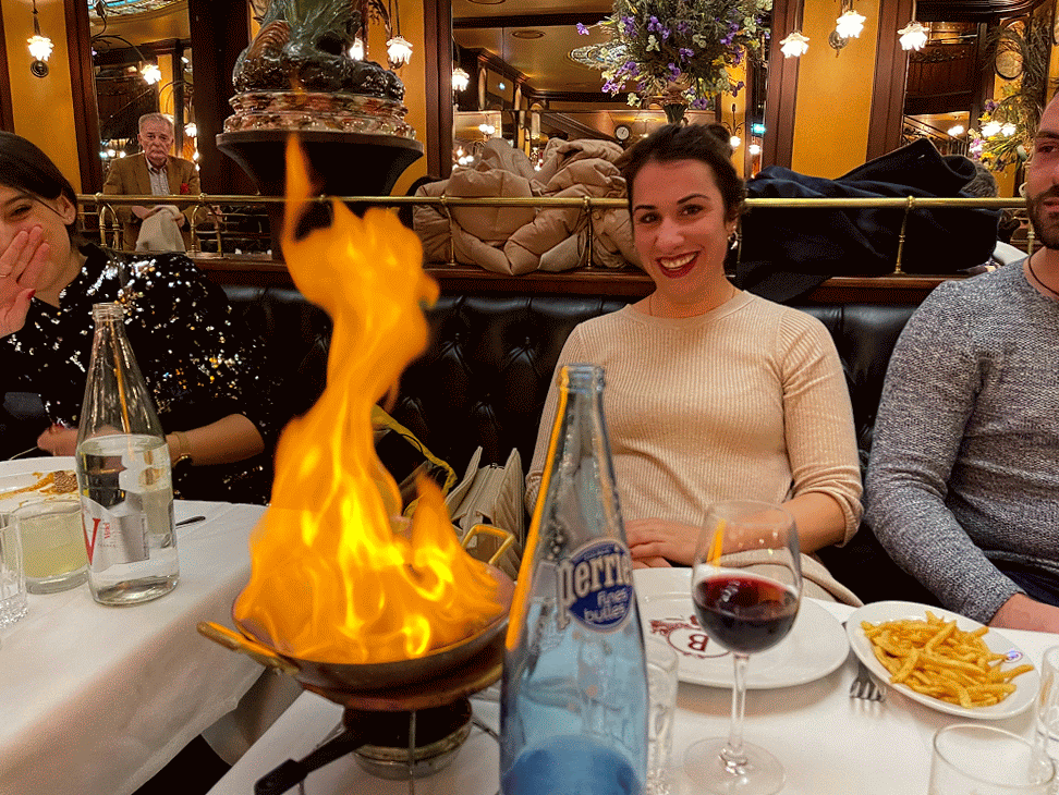 Draußen ist die Bastille ein Kreisel: Autos, Mopeds, das nervöse Glitzern der Laternen, die Stadt im Modus „Weiter“. Drinnen, bei Bofinger, macht Paris das Gegenteil: Es wird still, als hätte jemand die Uhr vom Strom genommen. In deinen Bildern sieht man das: das warme Gold des Innenraums, die schweren Polster, die Blumen über den Spiegeln, das Licht, das nicht beleuchtet, sondern beschwört. Und dann dieses Spektakel, das in Paris nie nur Speise ist, sondern immer auch Szene: ein Topf, ein Metallgestell, Flammen, die plötzlich hochschlagen wie eine spontane Opernarie; daneben ein Arrangement aus Fleisch, Kraut, Würsten – ein kleines elsässisches Drama auf weißer Bühne.