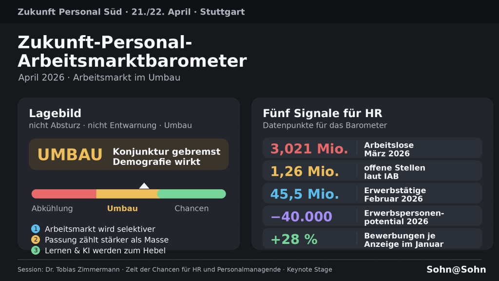 In diesen Befund gehört die Keynote von Dr. Tobias Zimmermann auf der Zukunft Personal Süd am 22. April 2026 in Stuttgart. Sein Thema: „Zeit der Chancen für Personalmanagement: Trends, Wahrheiten und Mythen zum Arbeitsmarkt 2026“. Der Titel klingt optimistisch, aber nicht beschwichtigend. Zimmermanns Buch „Zeit der Chancen“, erschienen im Campus Verlag, setzt nicht auf Trost, sondern auf Neuordnung. Schwache Konjunktur, Stellenabbau und Krisenstimmung bilden nur eine Seite. Auf der anderen stehen Arbeitskräfteknappheit, demografische Verschiebung, neue Aufstiegspfade, ein veränderter Suchmarkt und die wachsende Bedeutung der Personalarbeit als wirtschaftlicher Steuerungsfunktion.