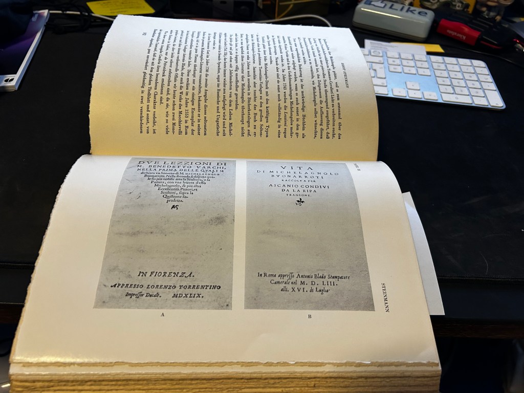 Dann kommt Condivi, und mit Condivi beginnt die Freude der Bibliophilen erst richtig. Die Vita Michelangelos von 1553, schreibt Steinmann, existiert in zwei verschiedenen Fassungen, obwohl sie mit demselben Titelblatt und sonst nahezu unverändert erschien. Die Forschung hatte das übersehen. Gori, der 1746 eine zweite Ausgabe veranstaltete, wußte davon nichts. In der zweiten Fassung wurden Passagen nachgeschoben, unter anderem über Julius III. und sogar über Dürers anatomische Versuche. Nur das Victoria and Albert Museum und das British Museum besaßen beide Fassungen. Steinmann selbst erwarb die zweite, vollständigere Fassung 1912 in der Libreria Loescher in Rom; die erste, seltenere, brachte ihm später sein Freund John Marshall ins Haus, ohne zu ahnen, daß er ihm damit genau jenes Exemplar schenkte, das er nicht mehr zu finden hoffte.