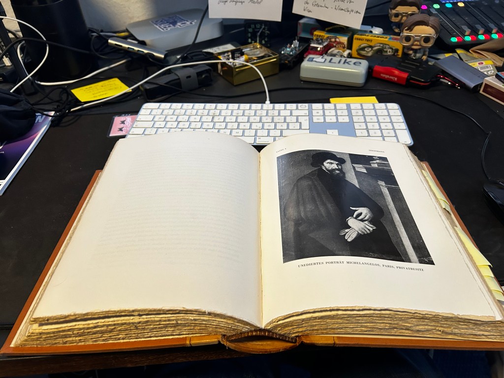 Von da an wird Steinmann immer mehr zur großen Figur seines eigenen Essays. Er jagt Gianottis Dialoge, erwirbt Daellis Michelangelo-Dokumente, klagt über unauffindbare Nozze-Publikationen, spottet über moderne Luxusdrucke, lobt Horne und die Merrymount Press, blättert im Inventar von Michelangelos römischem Haus und hält am Ende im British Museum ein venezianisches Exemplar der Gedichte Vittoria Colonnas in der Hand, das Michelangelo selbst besessen haben muß. Das Schöne an diesem Text ist nicht nur sein Wissen. Es ist seine Bewegung. Steinmann sitzt nie bloß an einem Schreibtisch; er verfolgt Spuren, vergleicht Fassungen, rettet Randnotizen, erkennt Fälschungen, registriert Eifersucht, Besitz, Verlust, Wiederauftauchen. Er ist Kunsthistoriker und Jäger zugleich, ein Mann, der die Literatur um Michelangelo nicht nur studiert, sondern bewohnt.