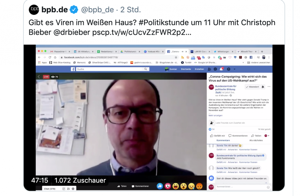 Mit Hannes Schleeh hatte ich das ja bereits bei Bloggercamp-tv durchgespielt. Da holten wir Obama und Merkel live in unsere Sendung – also ein doppelter Livestream. Diesmal war ich sogar in zwei Livestreams anfänglich als Interviewgast dabei, um dann sofort wieder in die Rolle des Moderators zu wechseln. Die Politikstunde wurde parallel moderiert und kuratiert – klingt verwirrend und ist technisch gar nicht so leicht umzusetzen. Klar, es gibt Plattformen, die ermöglichen die Ausspielung eines Livestreams auf unterschiedliche Dienste. Etwa restream.io mit Twitch, YT, Facebook und Periscope – bald auch LinkedIn. Das ist keine große Kunst. Was wir heute gemacht haben und in den nächsten Tagen machen werden, ist etwas anspruchsvoller.