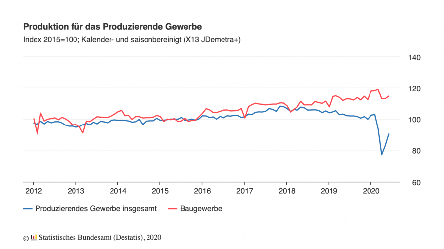 Seit dem Beginn der Corona-Krise ist der Produktionsindex mehrere Monate in Folge gefallen, seit Mai steigt er wieder. Im zweiten Quartal verringerte sich vor allem aufgrund der Einschränkungen im Shutdown-Monat April die Produktion im Produzierenden Gewerbe gegenüber dem Vorquartal um 16,1 Prozent. In der Industrie lag das Minus bei 19,3 Prozent, während der Ausstoß im Baugewerbe um 4,2 Prozent zurückgefahren wurde.