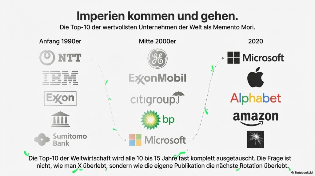Anhand der Ranglisten der „wertvollsten Unternehmen der Welt“ lässt sich die Fragilität dieser Imperien ablesen: Anfang der 1990er Jahre dominieren Telkos, Ölkonzerne, japanische Banken; Mitte der 2000er verschieben sich die Tabellen erneut; um 2020 stehen nahezu ausschließlich Tech-Konzerne und ein Ölmonopolist an der Spitze. Wer die Auswechslungsrate betrachtet, muss zur Kenntnis nehmen: Kaum ein Name hält sich länger als eine Dekade im oberen Feld, Microsoft ist die Ausnahme, nicht die Regel.