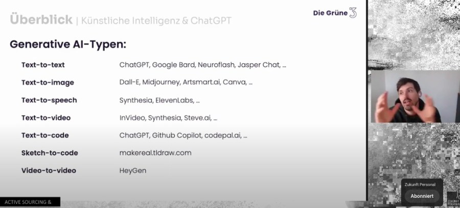 Die Kernfrage der Session mit Jan Hawliczek (Gründer der Grünen 3 GmbH) war, was ChatGPT ist und wie es sich in die Landschaft der Künstlichen Intelligenz einordnet.