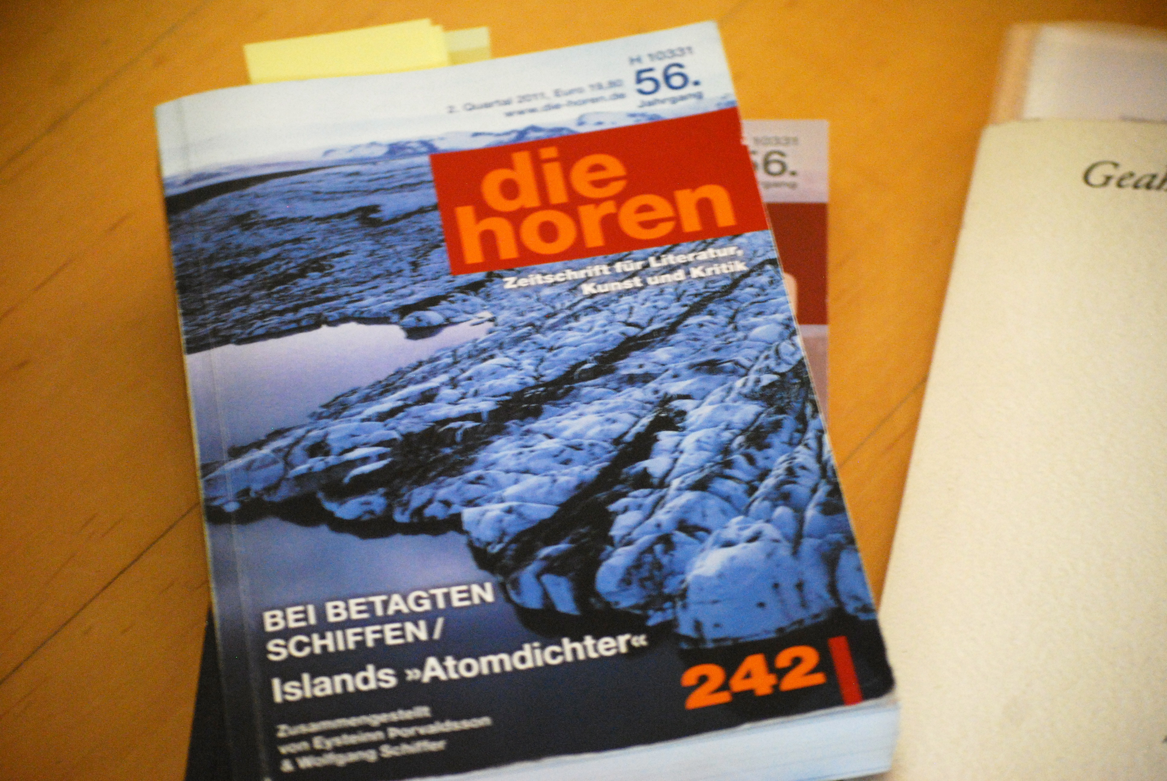 Der frühere Leiter der Programmgruppe Hörspiel und Feature im WDR sprach im Kultursalon Galerie Freiraum in Köln-Sülz über eine der aufregendsten Zeiten der isländischen Poesie. Bevor Neuseeland den literarischen Ehrengast der Frankfurter Buchmesse ablöst, berichtete Schiffer mit literarischen und journalistischen Beispielen über eine Kulturrevolution nach dem Zweiten Weltkrieg, die in dem Band „Bei betagten Schiffen – Islands Atomdichter“ (Mitherausgeber Wolfang Schiffer) auf 420 Seiten ausführlich dokumentiert ist.