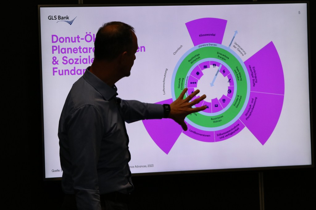 Kannacher stellte die Donut-Ökonomie als das zentrale Wirtschaftsmodell vor, das die GLS Bank in ihren Überlegungen prägt. „Hat jemand schon mal was von der sogenannten Donut-Ökonomie gehört?“, fragte er in die Runde und erklärte dann: „Es geht darum, dass wir wieder zusammen in dem Rahmen wirtschaften, wie uns der Planet das zur Verfügung stellt.“ Der Donut steht dabei symbolisch für die planetaren Grenzen: Außerhalb dieser Grenzen, so Kannacher, riskieren wir ökologische Katastrophen, während innerhalb des Donuts das soziale Fundament gestärkt werden muss. Das bedeutet, dass wir nicht nur die Umwelt schützen, sondern auch soziale Ungleichheiten abbauen.