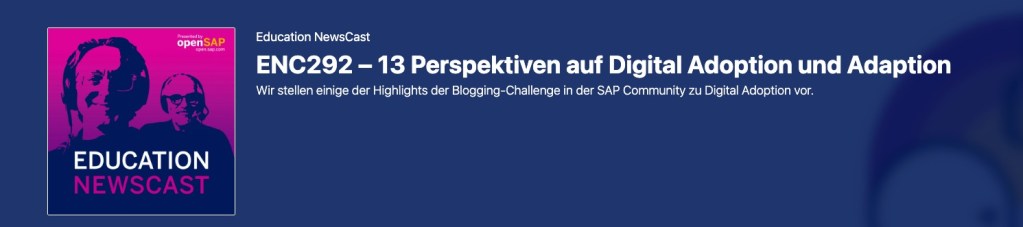Die Digitalisierung durchzieht alle Ebenen unseres Arbeitsalltags und fordert von Unternehmen nicht nur technologische, sondern auch kulturelle Anpassungen. Dies ist der Kern einer kürzlich in der SAP-Community durchgeführten Blogging-Challenge, deren Höhepunkte im SAP Education NewsCast diskutiert wurden. In der Podcast-Folge von Christoph Hafner und Thomas Jenewein gibt es interessante Einblicke und Erfahrungen zur digitalen Adoption – ein facettenreiches Thema, das von der Benutzerfreundlichkeit von Software bis hin zu organisatorischem Change Management reicht.