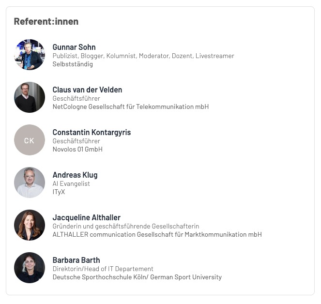 Wir werden das diskutieren am 14. September auf der Zukunft Personal Europe in Köln, um 16 Uhr auf der Keynote Stage: Panel mit Barbara Barth (Sporthochschule Köln), Jacqueline Althaller (Althaller Communication), Andreas Klug (Bitkom und Ityx), Constantin Kontargyris (Novolos) und Claus van der Velden (Netcologne).
