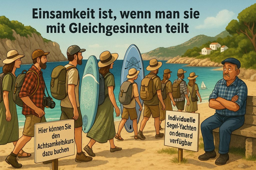 Es ist Sommer, und die saisonale Karawane der Achtsamkeit setzt sich in Bewegung. Der Pass wird gezückt, das Fernweh geölt – und ab geht’s, mit minimalem CO₂-Fußabdruck durch Ablasszahlungen an NGOs, maximalem Anspruch auf Ursprünglichkeit. Mal zieht es die Sinnsuchenden auf eine abgelegene Kykladeninsel, die „noch nicht vom Massentourismus verdorben ist“ (nur von ihnen selbst), mal in eine dalmatinische Bucht, „die wir zufällig bei Google Maps entdeckt haben“. Für Fortgeschrittene: ein verfallenes Trullo in Apulien, aufwendig restauriert – mit „liebevollem Charme“ und Infinity-Pool.