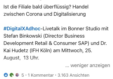 Ist die Filiale bald überflüssig? Handel zwischen Corona und Digitalisierung #DigitalXAdhoc-Livetalk im Bonner Studio mit Stefan Binkowski (Director Business Development Retail & Consumer SAP) und Dr. Kai Hudetz (IFH Köln)