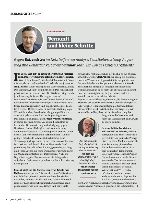 Beitrag, der 2019 im prmagazin erschien, ist aktueller denn je. Halte die Vorschläge auch für praktikabel – jenseits der Empörungsrituale. Im Jubiläumsjahr des Grundgesetzes sollten wir zudem mehr Verfassungspatriotismus im Sinne von Dolf Sternberger wagen.