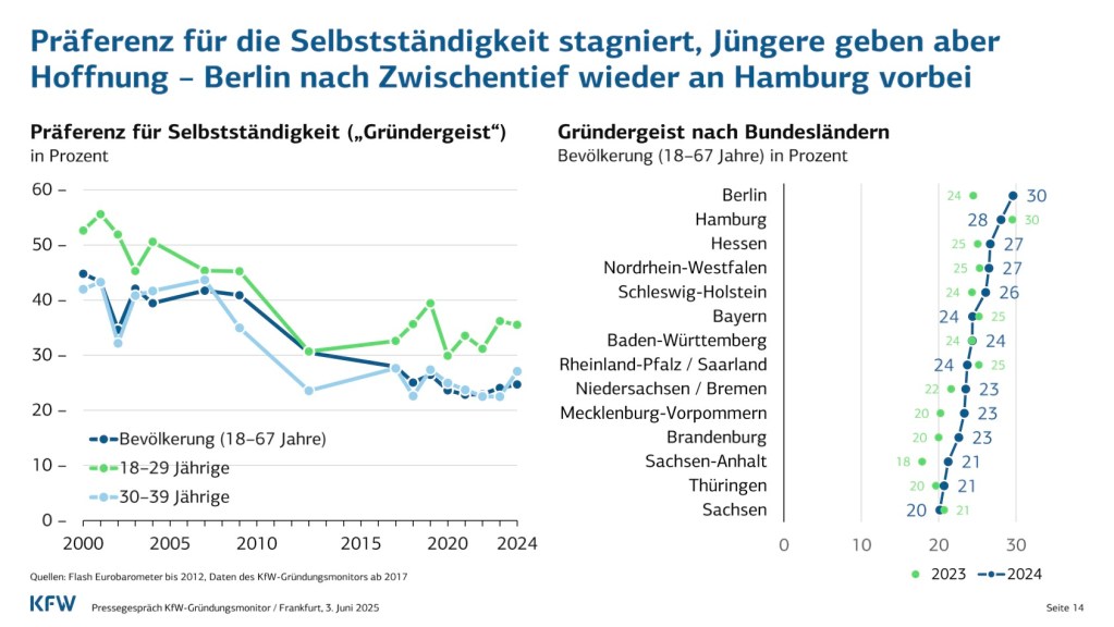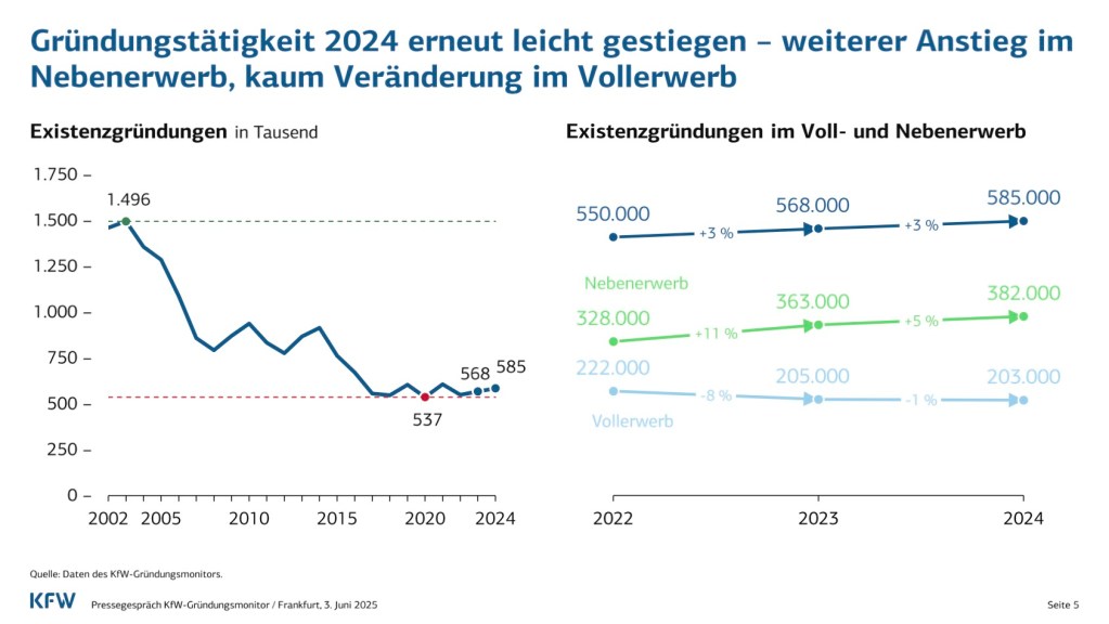 Die Zahlen belegen diesen Befund eindrucksvoll. Zwar ist die Zahl der Existenzgründungen 2024 auf 585.000 gestiegen – ein Zuwachs von drei Prozent im Vergleich zum Vorjahr. Doch diese leichte Erholung ist vor allem auf Nebenerwerbsgründungen zurückzuführen. Im Vollerwerb stagniert die Gründungstätigkeit, viele Gründungen sind vorübergehende Versuche, Nebenverdienste oder Übergangslösungen.