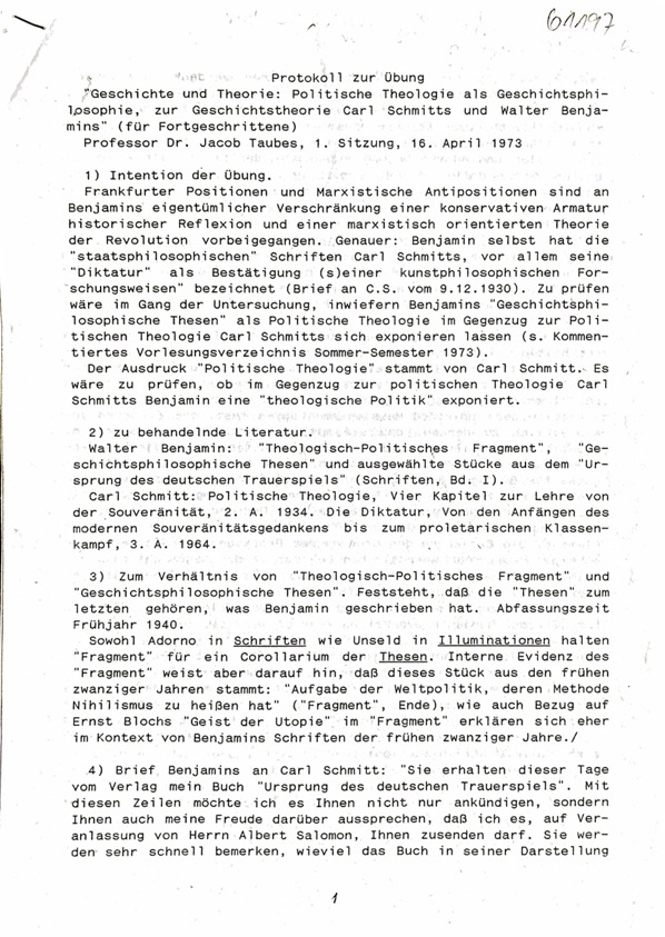 Das hat gesessen. So sehe ich das auch. Und wer sich Protokolle über die Lehrveranstaltungen von Taubes durchliest, wird merken, auf welch hohem Niveau das Ganze abgelaufen ist. Hier ein antiquarischer Fund aus dem Jahr 1973.