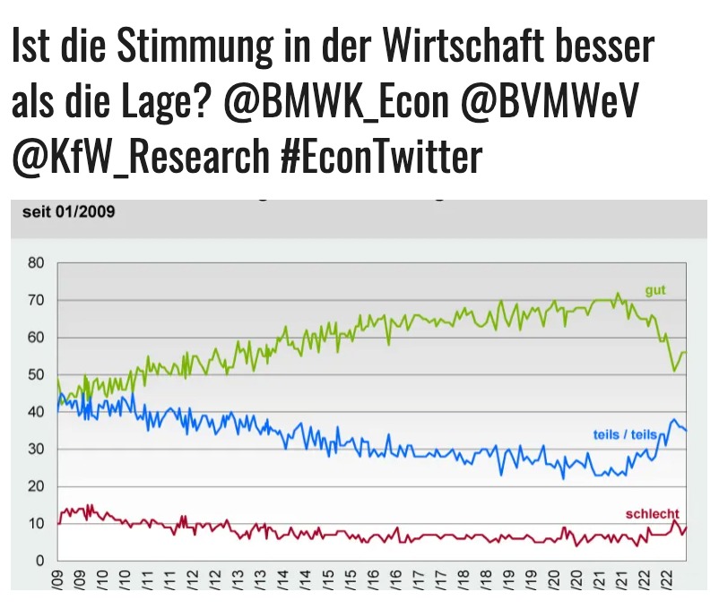 These: Die eigene wirtschaftliche Lage kann man mit belastbaren Daten bewerten. Und gab es auch im vergangenen Jahr eher positive Vorzeichen. Die Beurteilung der allgemeinen wirtschaftlichen Lage ist eher ein Abbild der Medienberichte. Und da dominiert in der Gefahren-Wahrnehmung Inflation und der Ukraine-Krieg.