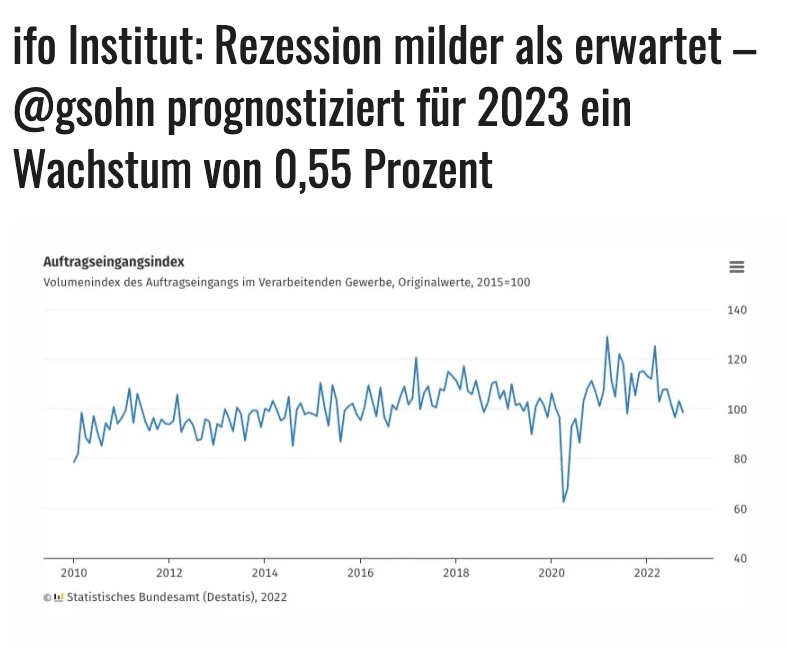 Bei den Konjunkturprognosen wird die Halbwertzeit wohl auch immer kürzer und rangiert auf dem Niveau von Börsen-Analysten: Wenn der Hahn kräht auf dem Mist, ändert sich das Wetter oder es bleibt, wie es ist. Aber das ist ja ein Dauerbrenner auf ichsagmal.com. Jedenfalls werde die erwartete Winterrezession milder ausfallen als bislang erwartet. Das meldet das ifo Institut in München. Demnach wird die Wirtschaftsleistung 2023 nur um 0,1 Prozent schrumpfen. Im Herbst erwarteten die Forscher noch minus 0,3 Prozent.