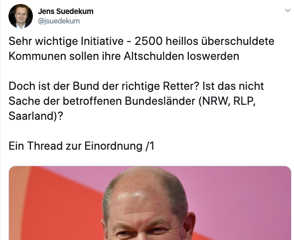 In einem 18-teiligen Thread hat Jens Suedekum sehr eindrücklich die Problematik der überschuldeten Kommunen beschrieben. Wichtig sind vor allem die Ursachen und die Wirkungen der hohen Schulden – und hier spielt der Bund eine große Rolle. Deshalb ist die Initiative von Finanzminister Olaf Scholz zur Entschuldung der Kommunen keine Großtat, sondern eine Bringschuld der Bundesregierung.