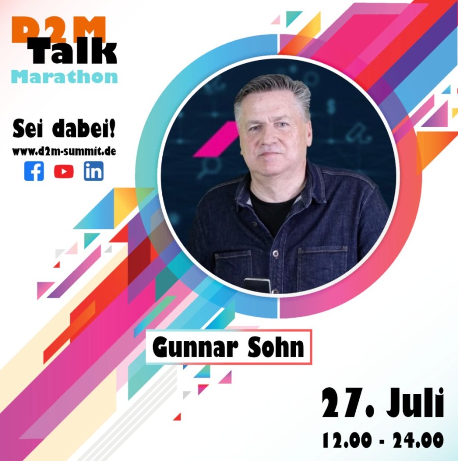 Im Einladungstext auf Facebook heißt es: „The One and Only Gunnar Sohn darf ebenfalls nicht fehlen bei unserem #d2mtalk Marathon am 27. Juli von 12.00 – 24.00 Uhr. Thorsten Ising & Björn Negelmann plaudern mit ihm um ca. 20.50 Uhr über Social Audio vs Live Streaming. Meldet Euch an!“