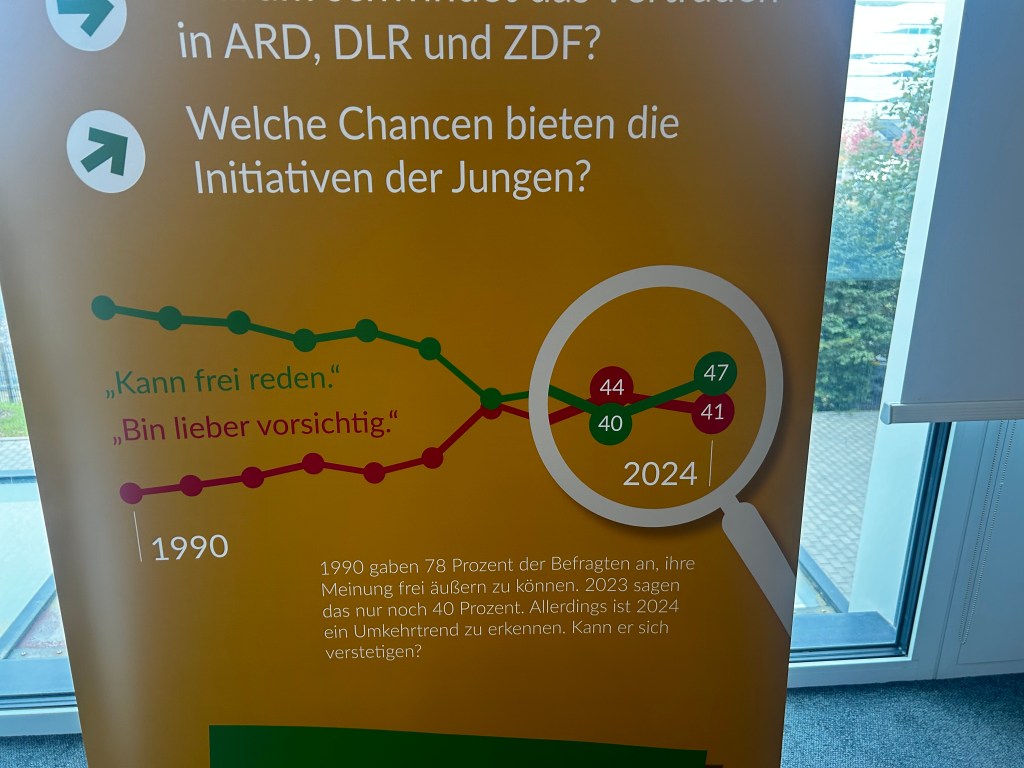 Im Tower angekommen, traf ich auf Roland Schatz, den Kopf hinter dem Media Tenor. Er stellte den Freiheitsindex 2024 vor, und während er sprach, spürte ich, dass hier ein weiteres Puzzlestück im Spiel war. „52 % der Deutschen fühlen sich wieder freier, ihre Meinung zu äußern,“ verkündete er, und doch war die Erleichterung nur von kurzer Dauer. 42 % der Befragten gaben immer noch an, dass sie sich lieber vorsichtig verhielten. Wie konnte es sein, dass in einem Land, das Meinungsfreiheit im Grundgesetz verankert hat, so viele Menschen Angst vor ihren eigenen Worten haben?