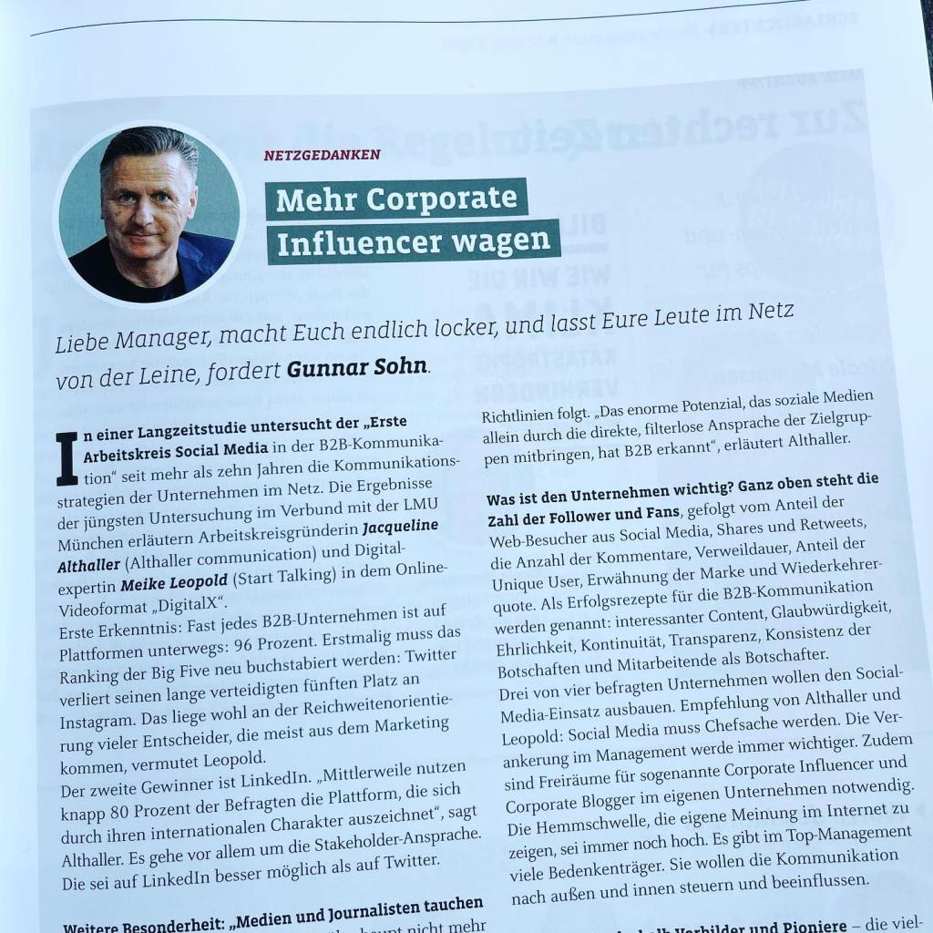 Man braucht deshalb Vorbilder und experimentierfreudige Pioniere, die mit gutem Beispiel vorangehen – die vielleicht sogar schon privat einen eigenen Blog, Video- oder Podcast-Formate betreiben. Interessant ist vor allem die Beobachtung, dass Unternehmensaccounts im Allgemeinen weit weniger Reichweite und Engagement erzielen, als wenn dieselben Inhalte, über persönliche Accounts von Mitarbeitern geteilt werden. Wer nur den offiziellen Weg über Websites oder stromlinienförmige PR-Botschaften geht, blockiert die Netzwerkeffekte der eigenen Influencer. Also macht Euch endlich locker und lasst Eure Leute von der Leine. Buchtipp: Jacqueline Althaller und Meike Leopold, Aufbruch in die digitale Dimension, Redline Verlag.