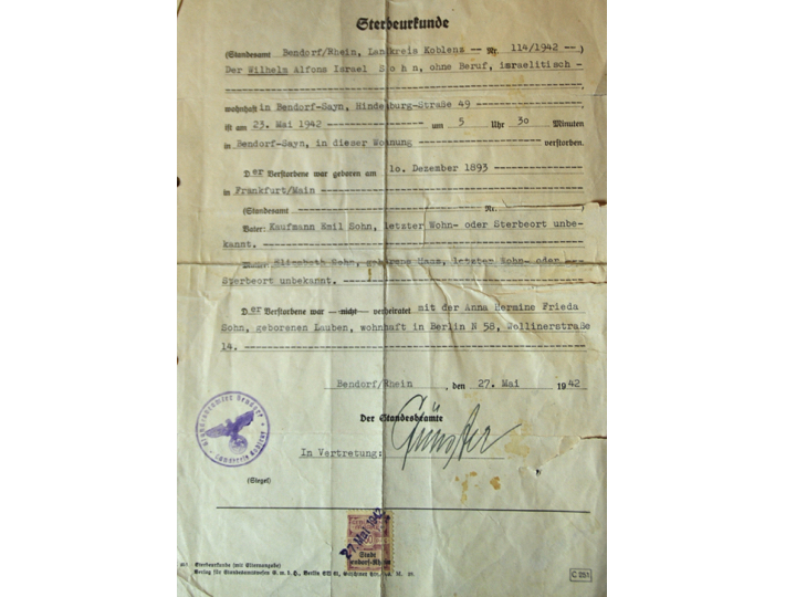 Mein Großvater starb unter ungeklärten Umständen kurz vor seiner Deportation nach Auschwitz am 23. Mai 1942. In der Sterbeurkunde nannte man meinen Opa übrigens Wilhelm Alfons Israel Sohn – “ohne Beruf, israelitisch”. Das war die perfide Praxis der Nazis. Ein zusätzlicher Vorname, der die Stigmatisierung schon im Ausweis kenntlich machte. Israel für Männer und Sara für Frauen. Und selbst seinen erlernten Beruf als Land- und Gastwirt hat man in der Sterbeurkunde unterschlagen.