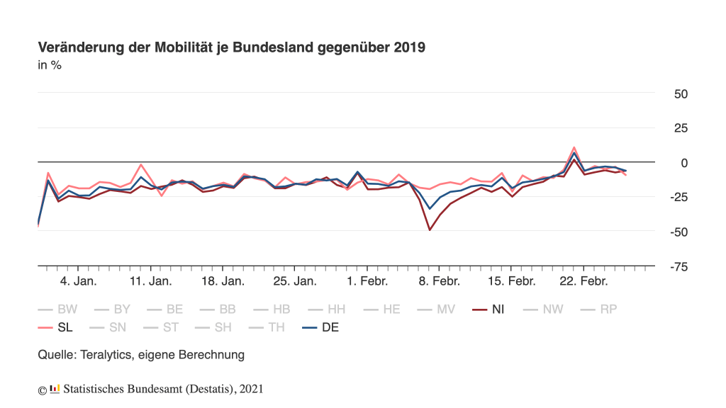 Ein Höchstwert der Mobilität im Bundesdurchschnitt wurde am Sonntag, den 21. Februar erreicht. Die Mobilität lag an diesem Tag bei frühlingshaften Temperaturen mit einem Anstieg von 6 % gegenüber 2019 erstmals seit Beginn des aktuellen Lockdowns über dem Vergleichswert des Vorkrisenjahres 2019.