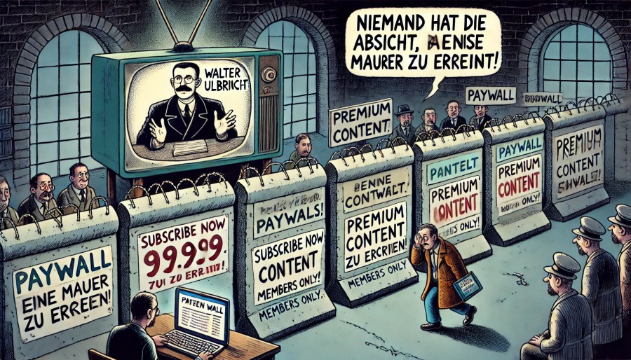 „Niemand hat die Absicht, eine Paywall zu bauen,“ sagte man uns, während die ersten Steinchen schon sorgfältig übereinandergelegt wurden, unsichtbar natürlich, weil niemand ja eine Mauer bauen will. Eine Mauer, klar, wer macht denn sowas heute noch? Nein, wir haben stattdessen die Paywall, die freundliche, unsichtbare Mauer des digitalen Zeitalters. Ohne Stacheldraht, dafür mit Monatsabo. Keine Wachtürme, aber Kreditkartenabrechnungen.