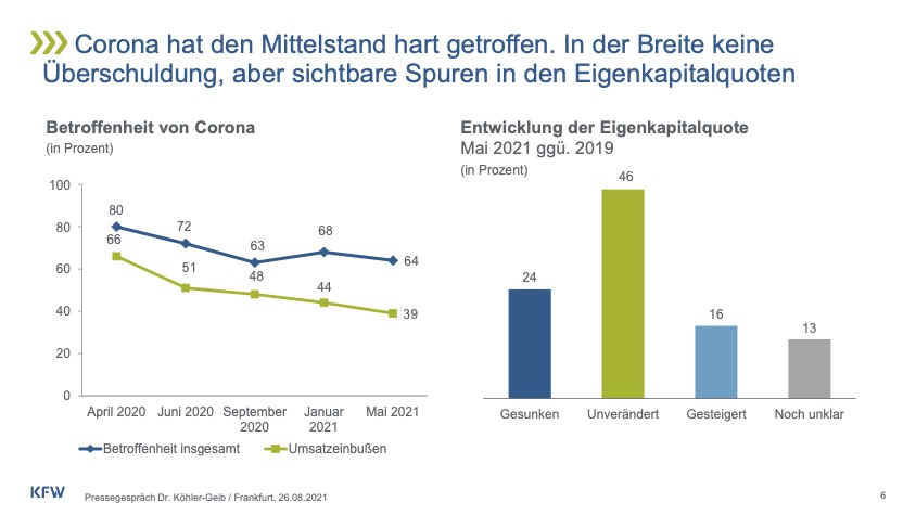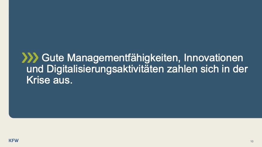 | Corona-Krise: Welche Unternehmen sind verstärkt betroffen und welche Lehren lassen sich aus der Krise ziehen? Die Folgen der Corona-Pandemie treffen den Mittelstand in seiner gesamten Breite. Jedoch fällt die Betroffenheit in einzelnen Segmenten des Mittelstands unterschiedlich stark aus. Welche Gruppen mittelständischer Unternehmen intensiver, welche weniger stark leiden und welche Lehren sich aus der Krise ziehen lassen, ist Gegenstand einer KfW-Analyse: |