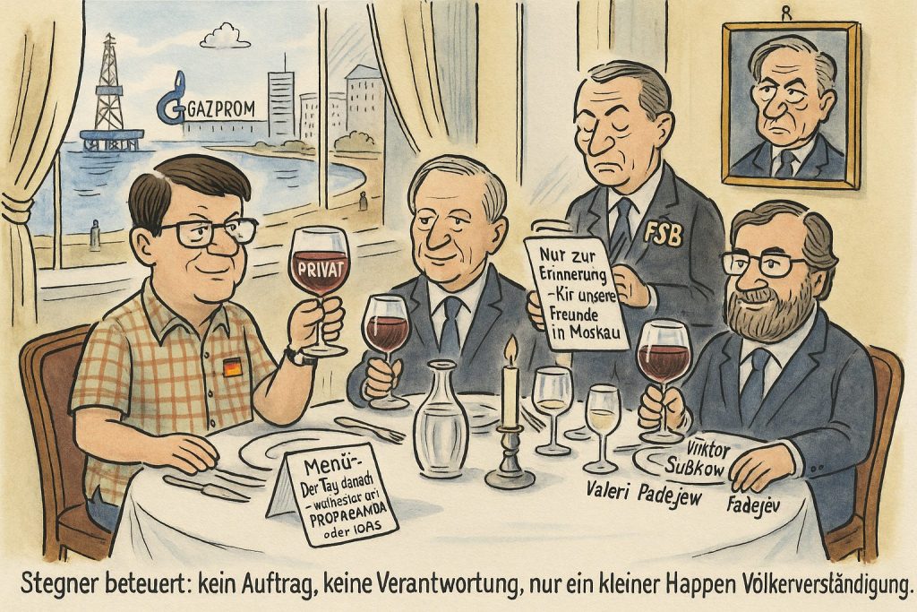 Plötzlich flüstert es wieder in den Gängen der Macht, als sei das Reich der Schatten noch nie abgedankt worden. Baku also. Nicht Brüssel, nicht Berlin – Baku! Eine feuchte Kapsel aus Öl, Gas und geopolitischem Grauen, eingelassen ins Kaspische wie ein schlecht verheilter Splitter. Und mittendrin die alten Männer des Petersburger Dialogs, jene wandelnden Erinnerungen an Schröders rotgetränkten Handschlag, Putins kalten Blick, den muffigen Dunst der Gaspipeline-Diplomatie. Stegner, Platzeck, Pofalla – als hätten sie nie aufgehört, sich im Halbdunkel zu treffen, als sei die Zeit stillgestanden, seit das letzte Canapée serviert wurde.