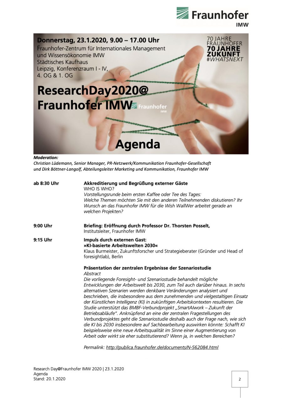 „KI schafft neue Arbeitswelten in einem dynamischen Netzwerk beschreibt eine Zukunft, in der die Potenziale von KI konsequent die Transformation in eine energie- und ressourceneffiziente Circular Economy fördert. Es ist geprägt von einem allgemeinen Vertrauen in die Problemlösungsfähigkeit von KI“, schreiben die Studienautoren. Diese Szenarien und viele andere Themen werden wir am Donnerstag ausführlich erörtern. Einfach mal unter dem Hashtag #ResearchDay2020 schauen, was wir live berichten – und natürlich mitdiskutieren und Fragen stellen.