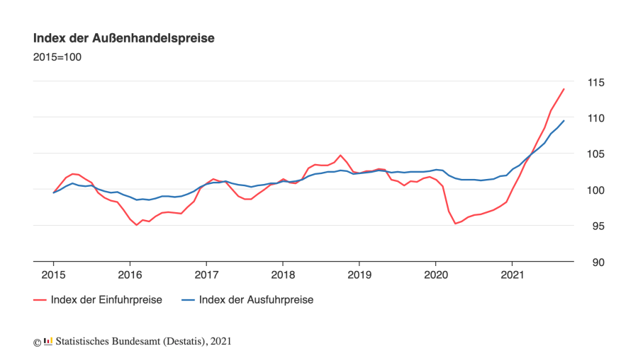 Die Importpreise waren im September 2021 um 17,7 Prozent höher als im September 2020. Eine höhere Vorjahresveränderung hatte es zuletzt im August 1981 bei der zweiten Ölpreiskrise gegeben (19,5 Prozent gegenüber August 1980). Wie das Statistische Bundesamt weiter mitteilt, hatte die Veränderungsrate gegenüber dem Vorjahr im August 2021 bei +16,5 Prozent gelegen, im Juli 2021 bei +15 Prozent. Ein Ende der Preisspirale ist nicht zu erkennen.