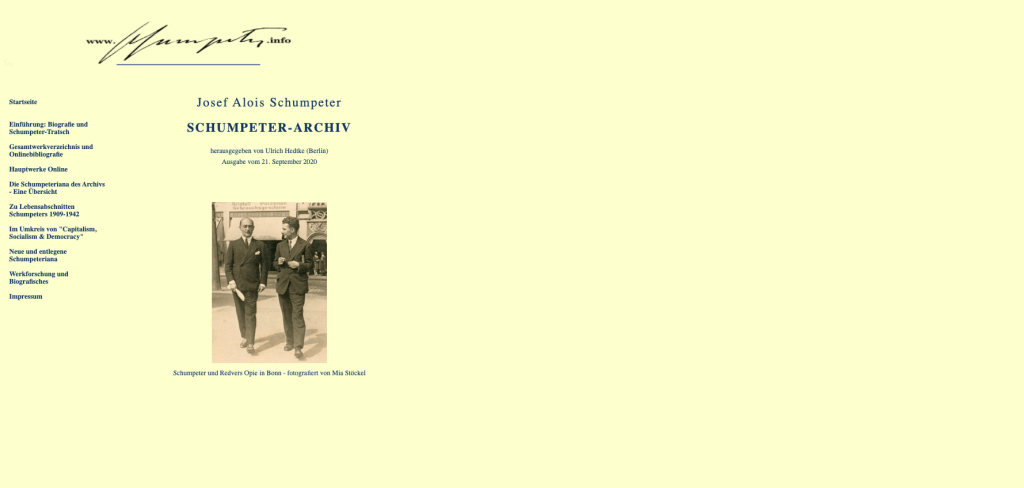 „Zum Jahresende kann ich (endlich) mitteilen, dass das Kapitel “Im Umkreis von Capitalism, Socialism & Democray” des Schumpeter-Archivs auch das Gesamtkonvolut von Schumpeters Vorarbeiten, Entwürfen und Notizen zum Werk vorstellt, sowohl die 2015 als Privatdruck erschienene Pionieredition durch Shin-ichi Uraki und Katsuhiko Imai wie auch eine von mir in Zusammenarbeit mit Karl Benne (Boston) erarbeite Neufassung des Materials. Letztere bietet als Online-Edition auch die Möglichkeit, die deskribierten Archivalien per Link mit den jeweils zugrundliegenden Originalen zu vergleichen und referiert in der Einleitung überdies verschiedene mit Schumpeters Arbeiten am Werk thematisch eng zusammenhängende Internetpublikationen der archivführenden Mi University Library in Tsu.“