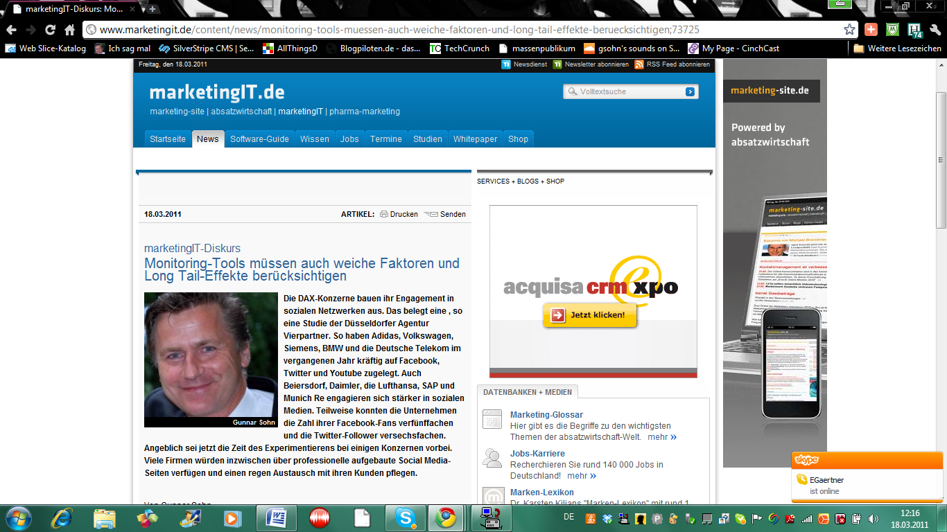Wie angekündigt, kommt hier noch eine Story zur Fliegenbein-Zählerei. Die DAX-Konzerne bauen ihr Engagement in sozialen Netzwerken aus, so eine Studie der Düsseldorfer Agentur Vierpartner. Teilweise konnten die Unternehmen die Zahl ihrer Facebook-Fans verfünffachen und die Twitter-Follower versechsfachen. Angeblich sei jetzt die Zeit des Experimentierens bei einigen Konzernen vorbei. Hier regt sich allerdings Widerspruch. Soweit die Kurzfassung der Studie. In meiner Abhandlung gehe ich kritisch auf diesen Befund ein: