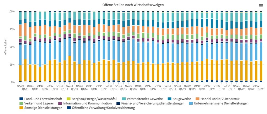 Einen umfassenderen Überblick über die nicht realisierte Arbeitskräftenachfrage gibt eine repräsentative Betriebsbefragung des Instituts für Arbeitsmarkt- und Berufsforschung (IAB) zum gesamtwirtschaftlichen Stellenangebot1, die vierteljährlich durchgeführt wird. In der Erhebung werden auch jene Stellen erfasst, die der Bundesagentur für Arbeit nicht gemeldet sind. Angaben des IAB zum gesamtwirtschaftlichen Stellenangebot liegen für das erste Quartal 2023 vor. Im ersten Quartal betrug das Stellenangebot 1,75 Millionen Stellen, das waren 237.000 oder 12 Prozent weniger als im Vorquartal und 8.000 oder 0,4 Prozent mehr als ein Jahr zuvor. Vom gesamtwirtschaftlichen Stellenangebot waren nach den Ergebnissen der Betriebsbefragung 40 Prozent den Arbeitsagenturen oder Jobcentern gemeldet (Vorjahr: 43 Prozent).