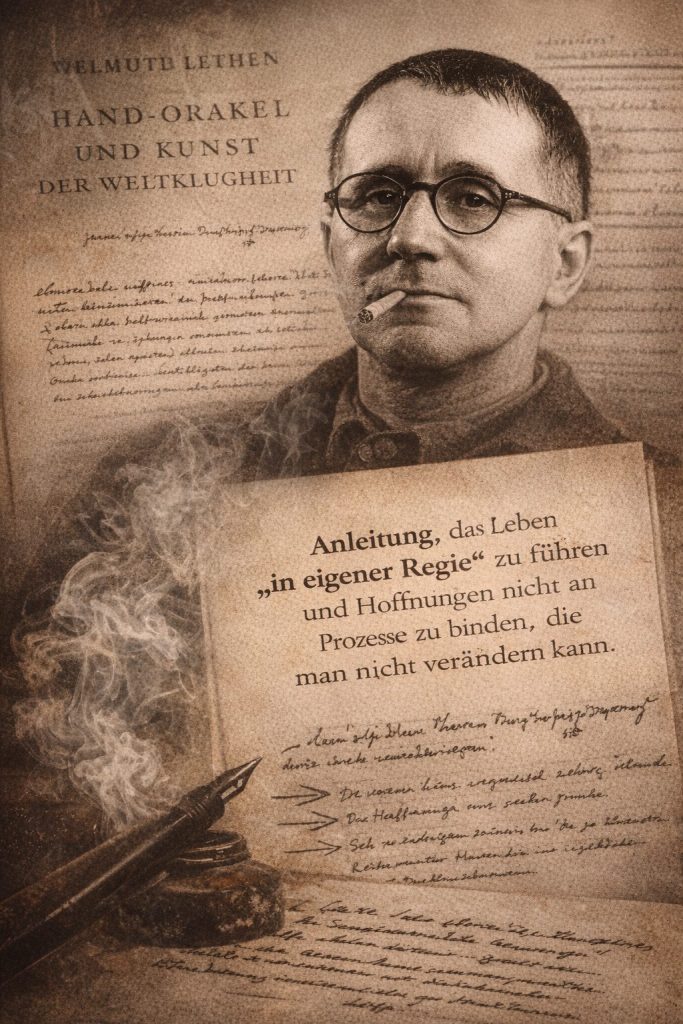 Brecht nimmt Gracián nicht als Zynikerschule, sondern als Handbuch der Selbstbehauptung in einer Welt, die Menschen in Rollen presst. Die 26 Markierungen sind weniger ein Bekenntnis zur Amoral als ein Vokabular der Beweglichkeit: Rückzug, Verzögerung, Unbestimmtheit, Zeitgewinn, Maskenkompetenz. Weltklugheit heißt dann: nicht „recht haben“, sondern nicht festgelegt sein – und gerade dadurch die Möglichkeit offenhalten, anders zu handeln.