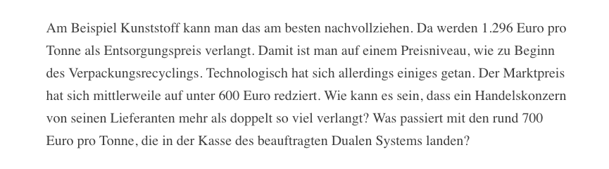 So schreibt Andreas Mihm: „Bisher dürfen nur vorher durch den ‚grünen Punkt‘ lizenzierte Verpackungen in den Wertstofftonnen oder gelben Säcken entsorgt werden.“
