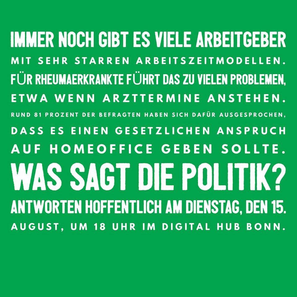 Unter Moderation von Arzt und Fernsehkorrespondent Dr. Christoph Specht diskutierten die Bundestagsabgeordneten Katja Dörner (Grüne), Sozialdemokrat Ulrich Kelber und die Landespolitikerin und selbst an rheumatoider Arthritis erkrankte Franziska Müller-Rech von der FDP. Den Fragen stellen sich auch der CDU-Politiker Alfred Giersberg vom Stadtrat Bonn, Michael Castillo, Gesundheitsmanager bei der Deutschen Telekom und Herbert Schulte, Landesgeschäftsführer NRW des Bundesverbandes mittelständischer Wirtschaft. Die Präsidentin der Deutschen Rheuma-Liga, Rotraud Schmale-Grede und Vizepräsidentin Marion Rink forderten, chronisch Kranken einen langfristigen Arbeitsplatz zu ermöglichen und sie vor Altersarmut zu schützen.