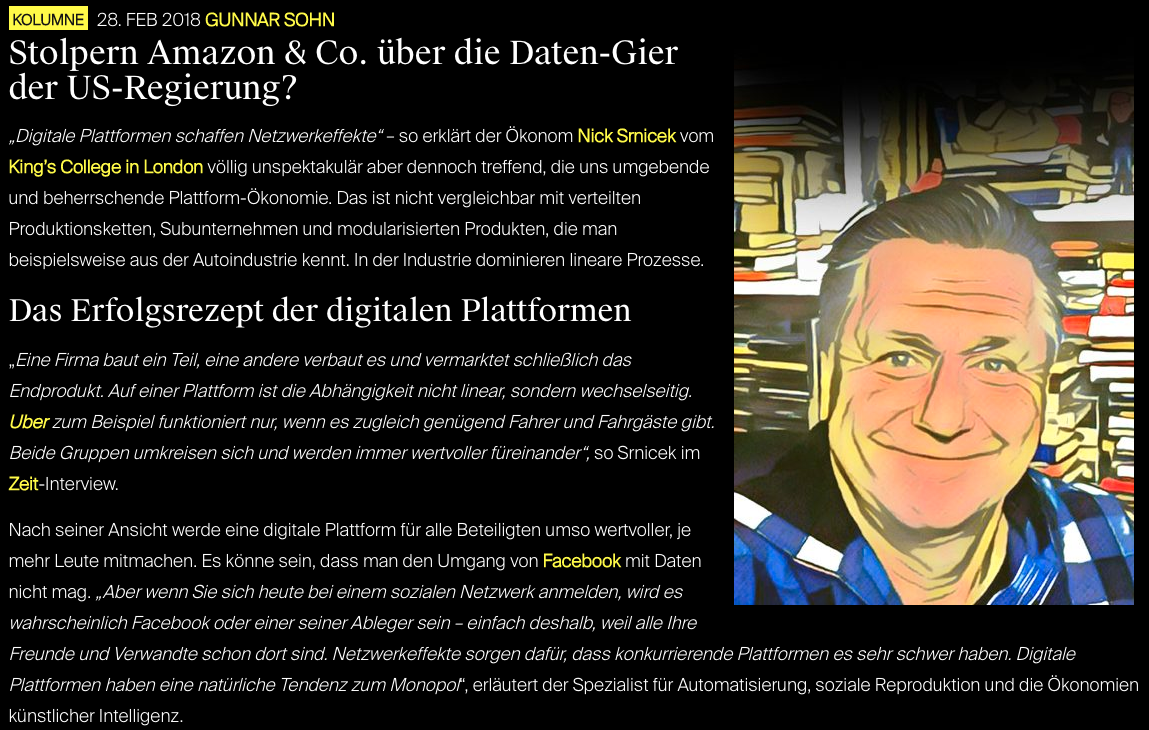 Wie soll das technisch, ökonomisch und rechtlich funktionieren? Ich denke jedenfalls, wir müssen neue Modelle entwickeln, zum Beispiel wie eine öffentliche und gemeinnützige Kontrolle aussehen könnte. Das Thema drängt, aber die Diskussion hat noch gar nicht richtig begonnen. Vielleicht stolpern die Big Five des Silicon Valley ja über die Daten-Gier von NSA & Co. Wäre ein Treppenwitz. Ausführlich in meiner Netzpiloten-Kolumne nachzulesen.