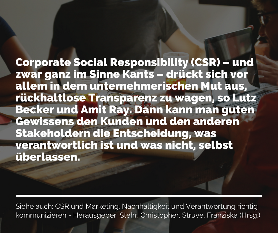 CSR – und zwar ganz im Sinne Kants – drückt sich vor allem in dem unternehmerischen Mut aus, rückhaltlose Transparenz zu wagen, so Becker und Ray. Dann kann man guten Gewissens den Kunden und den anderen Stakeholdern die Entscheidung, was verantwortlich ist und was nicht, selbst überlassen. Mit den beiden Autoren habe ich mich ausführlich unterhalten.
