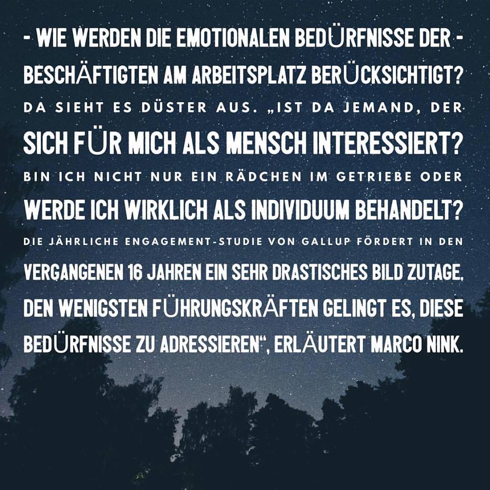 „Ist da jemand, der sich für mich als Mensch interessiert? Bin ich nicht nur ein Rädchen im Getriebe oder werde ich wirklich als Individuum behandelt? Die jährliche Engagement-Studie von Gallup fördert in den vergangenen 16 Jahren ein sehr drastisches Bild zutage. Den wenigsten Führungskräften gelingt es, diese Bedürfnisse zu adressieren“, erläutert Nink.