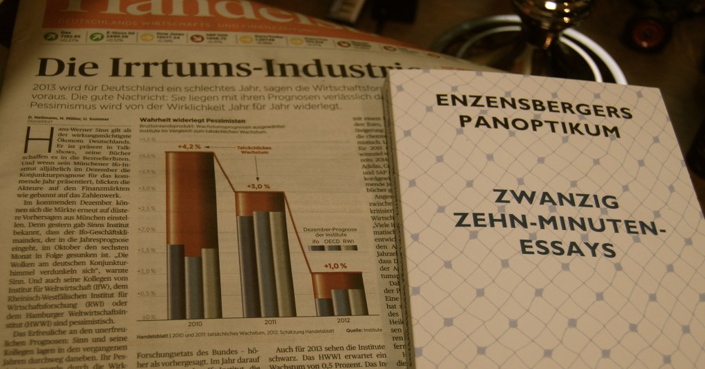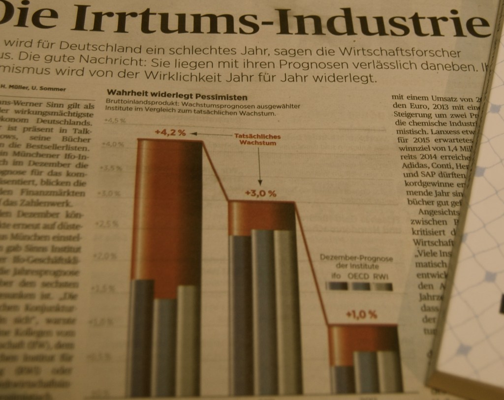 Die Fehlerquote hat übrigens zugenommen im Vergleich zu den 1980er Jahren. Warum die Präsidenten dieser Wahrsager-Institute dann immer so bedeutungsschwer in der Bundespressekonferenz aufschlagen und im Blitzlicht-Gewitter mit Mister-Wichtig-Miene dem Wirtschaftsminister ihren Bericht übergeben, ist mir schleierhaft. Die sollten da lieber Bingo spielen und Rubbel-Lose verteilen – das hätte mehr Substanz.