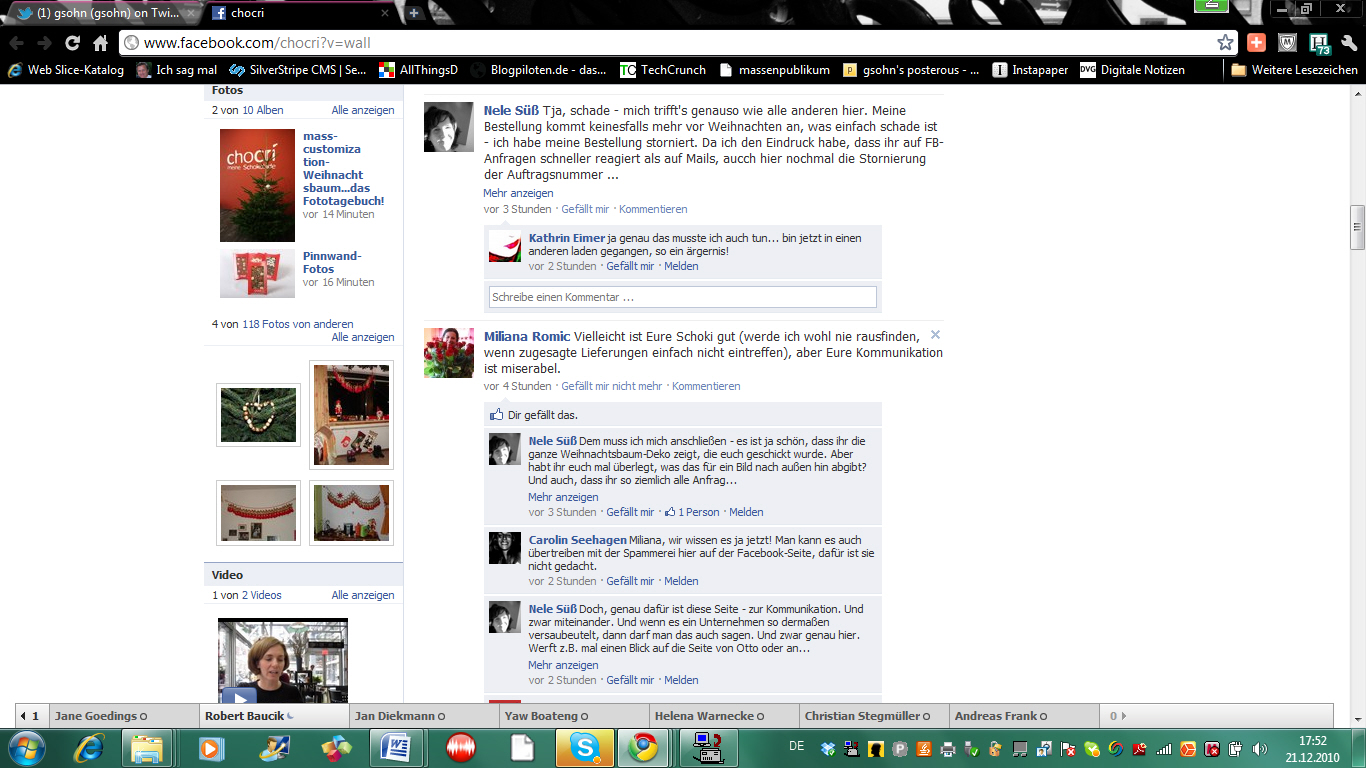 Ich habe hier nun schon einiges über unterirdische Servicekonzepte gepostet, kritisierte unfähige Call Center-Unternehmen und mangelhafte Dienstleistungskonzepte. Aber was sich auf der Facebook-Fanseite von Chocri abspielt, ist wirklich der Gipfel der Ignoranz. Dort veröffentlichen Kunden eine Vielzahl von Beschwerden über nicht eingehaltene Liefertermine, monieren die zu späte Information über Lieferungen, die vor Weihnachten nicht erfolgen. Statt sich höflich, demütig und sachlich mit den Serviceschlampereien auseinanderzusetzen, werden unliebsame Beschwerden als Spamerei denunziert. So, liebe Chocri-Freunde, kann man mit Kommentaren von unzufriedenen Verbrauchern in sozialen Netzwerken nicht umgehen. Da solltet Ihr Euch mal ein wenig an der Community GetSatisfaction orientieren, um zu kapieren, wie sich die Meinungsbildung zwischen Unternehmen und Verbrauchern verändert. Die Zeiten der Einweg-Berieselung sind vorbei – auch wenn Ihr noch so cool wirken wollt.